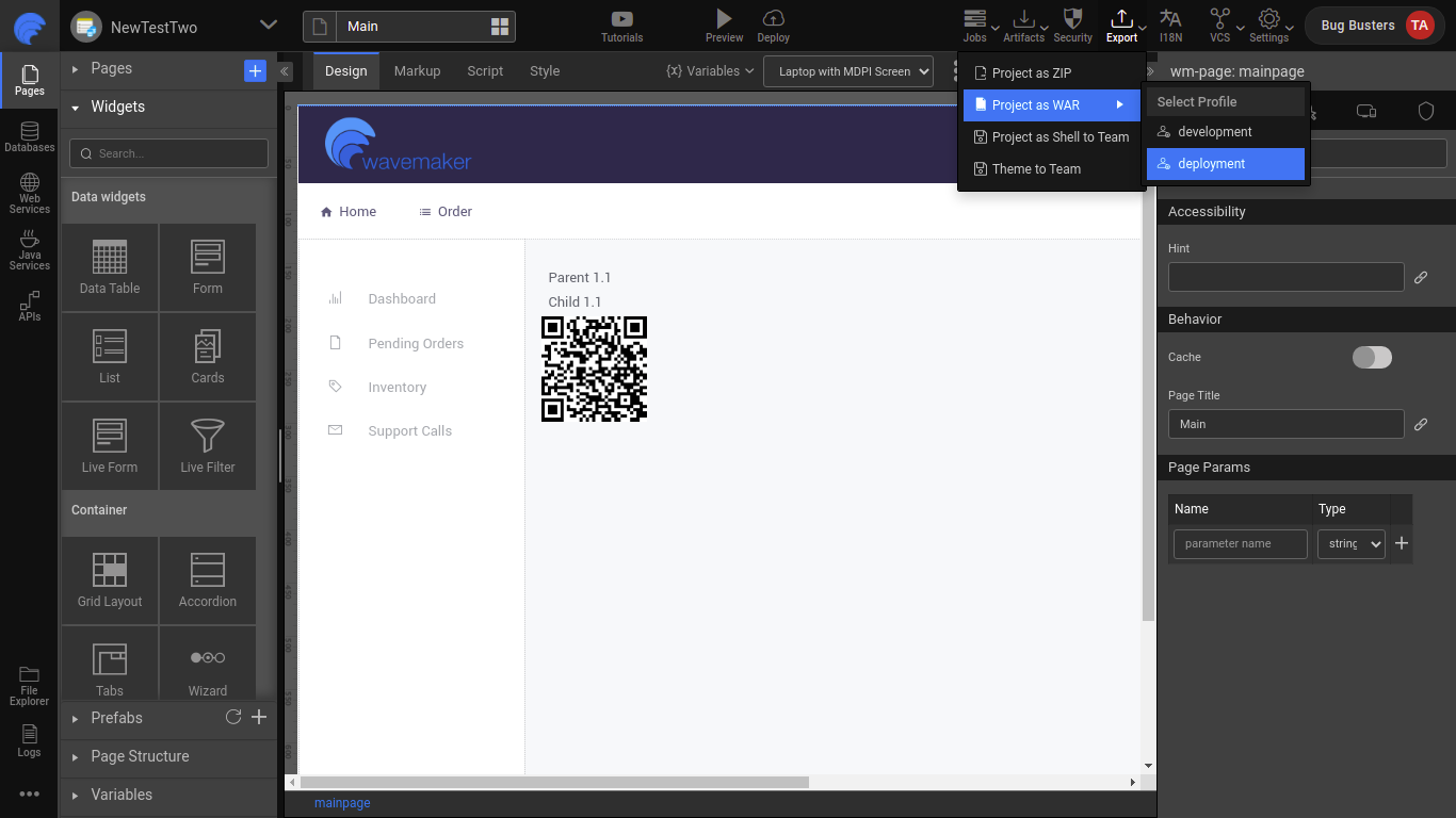 To export the project in war, click Export and select Project as WAR. Next, select the configured profile. For example, WaveMaker displays default profiles; select development profile, or deployment profile. If you create a custom profile, select the custom profile name which displays under the Select Profile option. On clicking the profile, the project files will download.