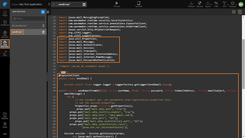 - Add the import statements for the required classes in your Java Service file. In this example, we have used the mail.jar, the package details of which can be found at https://javamail.java.net/nonav/docs/api/. To use this jar file to send emails we will be using the following code in the Java Service file after adding the import statements for the required class files: