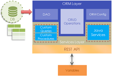 - You, as an App Developer, can access the Entities from the ORM Layer, write custom queries, procedures and Java Services to extend the database functionality.
