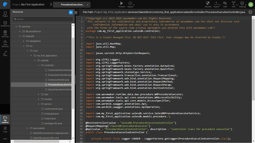 There will be times when you want to display data from multiple tables or update/insert values into multiple tables. Queries and Stored Procedures come in handy in such instances. WaveMaker provides editors for Queries & Procedures for integrating them with the WaveMaker applications. Each query & procedure used in the WaveMaker application will be exposed as a REST API for the UI to consume and render the data.