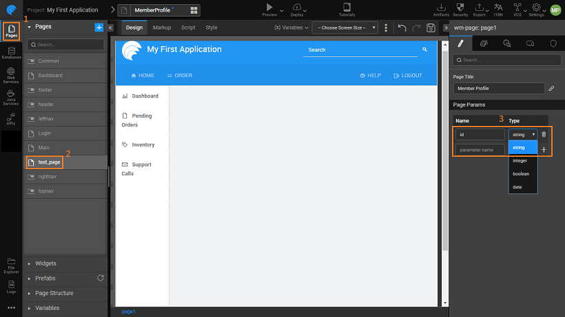 • The Application-scoped Navigation Action generated by default by WaveMaker for test_page can be used to bind a value for the id field from the Main Page. The param will be available in the data tab of the Actions (goToPage_test_page). You can also create another Navigation Action and use it in a different navigation flow.