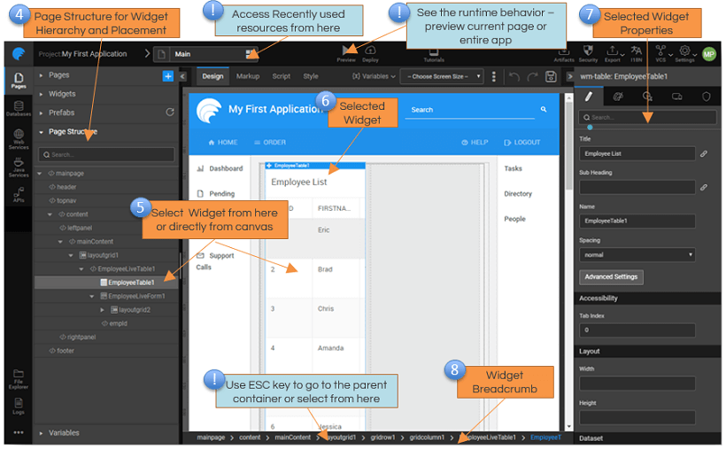 8. Widget hierarchy shows the widget construct and allows you to traverse to the parent container.