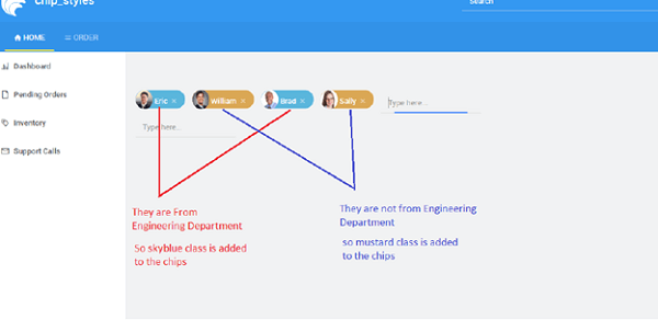 - Setting the chip item class name (or Class Name property) as skyblue, will apply skyblue class to all the chips at runtime.