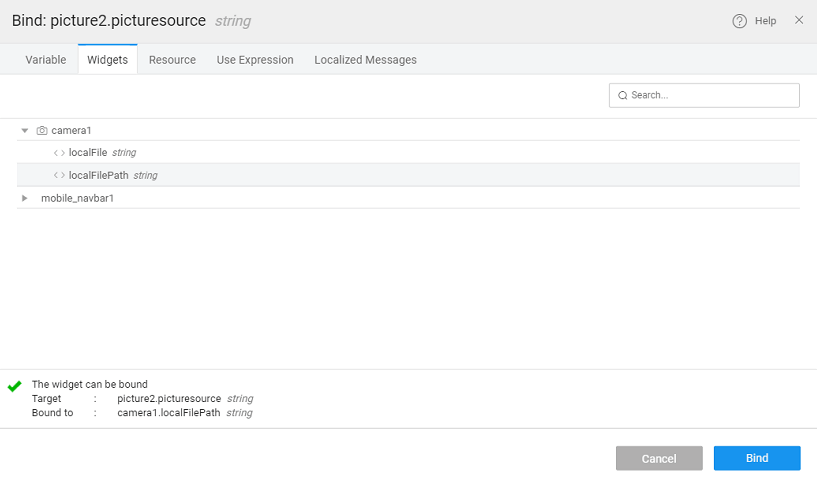 - Bind the source of the picture to the ‘localFilePath’ of camera widget.
