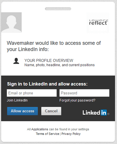 8. After you run the application, redirect URL is generated. You might have to click REMOVE TOOLBAR to get the URL. Copy the redirect uri till the _callback _part. For example, if your url looks like this: https://www.linkedin.com/uas/oauth2/authorization?client_id=xxx&response_type=xxx&redirect_uri=https://www.wavemakeronline.com/run-xyz/projectname/prefabs/LinkedInOAuth/oAuthHandler/callback&state=xxx&scope=xxx use only: https://www.wavemakeronline.com/run-xyz/projectname/prefabs/LinkedInOAuth/oAuthHandler/callback