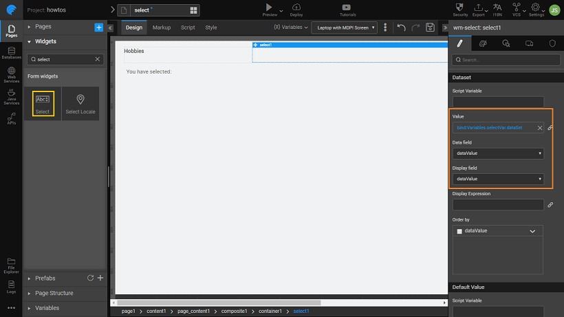 A Select widget can be used in various ways based on the source of data. Each type of data source needs a different approach. WaveMaker Select widget works in any one of the following ways: