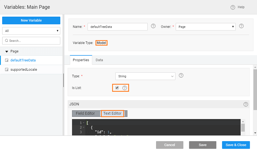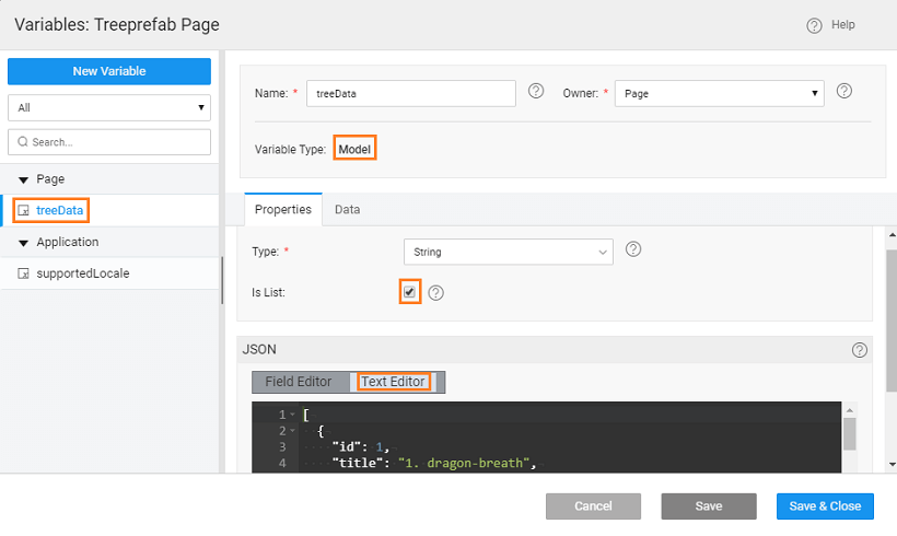 - From Main Menu use Create option to Create a Static Variable, defaultTreeData, to hold the default tree structure. Select the is List option and enter the Json structure. The structure needs to include id, title, and nodes for subitems.