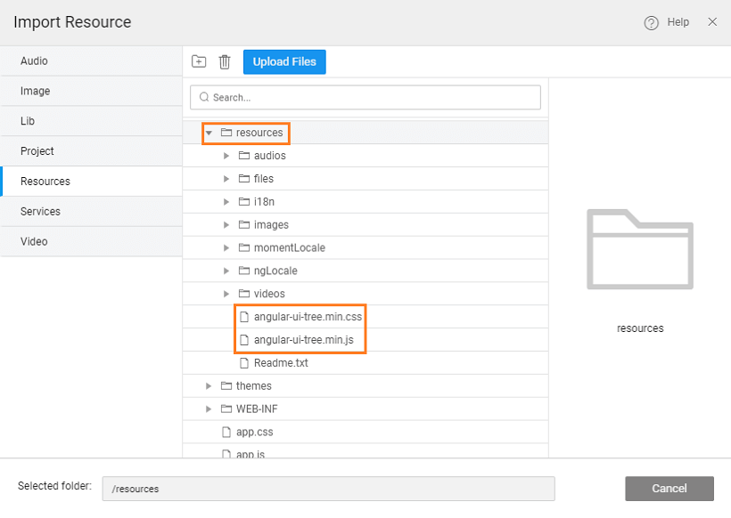 - Import the css and js files to the resources folder, using the Import option from Main Menu.