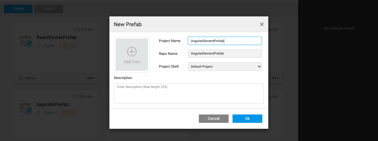 • Enter a Name and Description for the Prefab