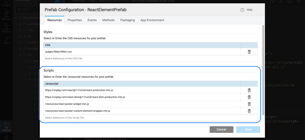 • From the Project Screen, choose Config Prefab under Settings. In the Resources tab, update Scripts with the JS file imported in the previous step. As we are rendering React elements inside out custom element wrapper, we should import React & React DOM libs as well.