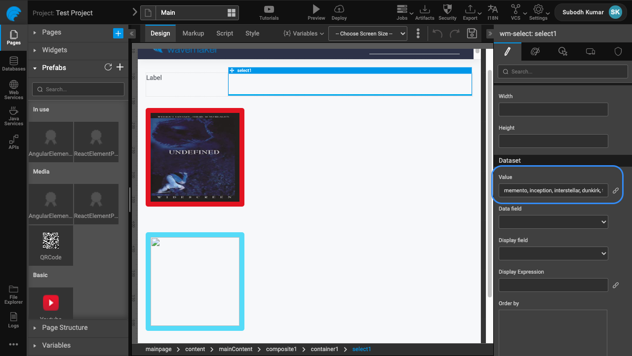 • Drag & Drop a Select widget into the page, & provide static list of movie title as its Dataset value. We will be binding the selected title as the input for Prefabs.