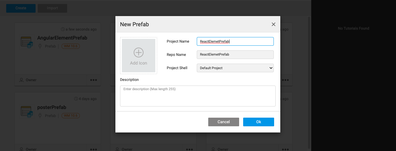• Enter a Name and Description for the Prefab