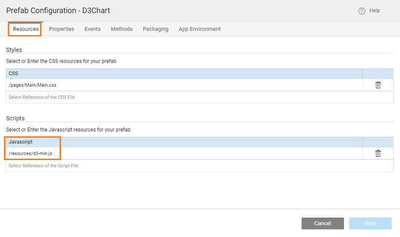 - From Resources, include the script and css files imported earlier, you can pick from the drop down list