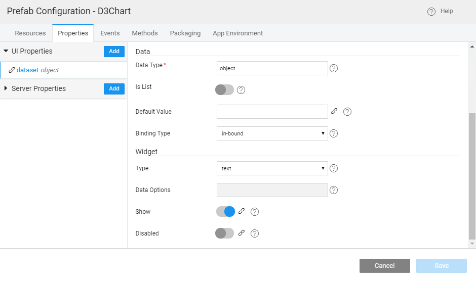 - Add Property - dataset with attributes Widget set to text, Type set to object (type it, if not selectable) and Bindable set to in-bound