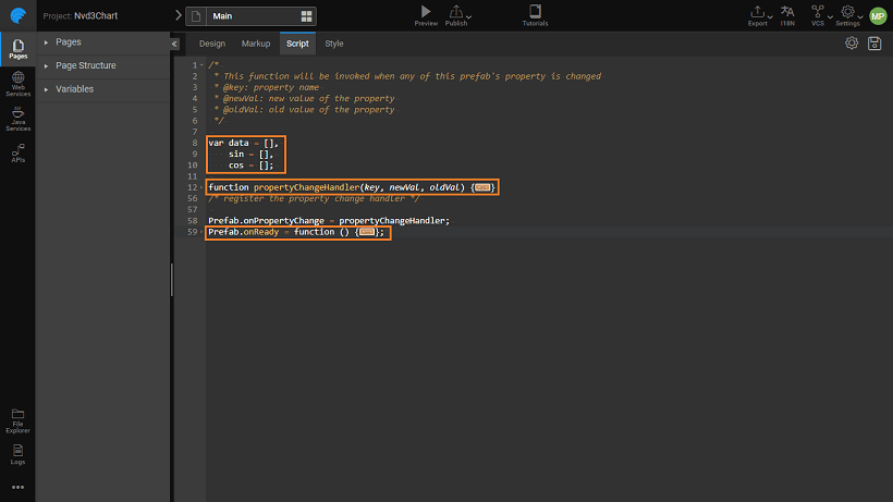 Prefab.onPropertyChange = propertyChangeHandler;- Enter the following code (you can copy and paste the same). This code is to set up the visual rendering of D3 chart.