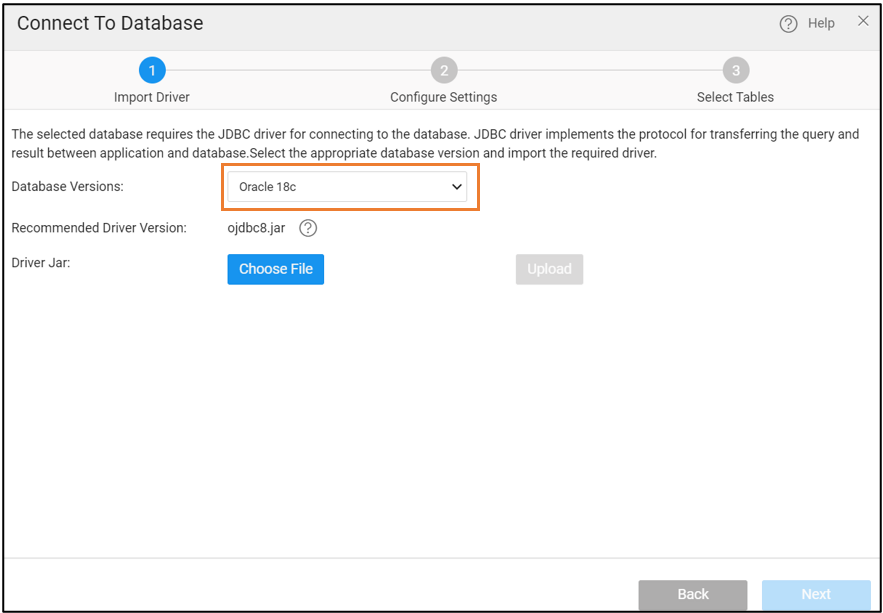 - Upload the Driver Jar and click Next. For further configuration details, see Connect to Database.