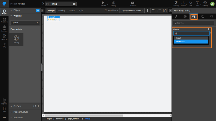 1. Enter the following script. This script captures the rating value as changed by the user, and changes the color of the widget appropriately.