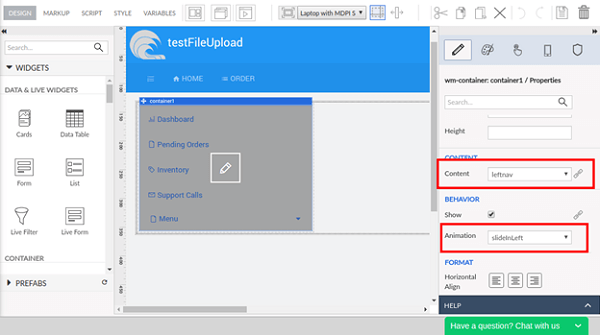 - Add a container in this grid column and choose the Content property for the container widget from the properties panel as “leftnav”. Here, we have added an animation for the container widget as “slideInLeft”. You can choose any animation as per your choice.