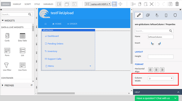 - Add a grid layout (let’s name it as leftnavColumn, this name will be used in further implementation) in the Main page content. For the gridcolumn first grid row, specify the columnwidth as 3.
