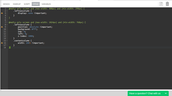 and write the following style snippet:@media only screen and (max-width: 480px) and (min-width: 299px) { .leftnavcolumn { display: none !important; } }