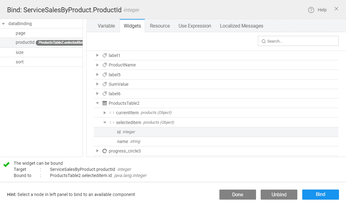ServiceSalesByProduct, configure the Data to bind withproductId. - Go to the widgets tab, select