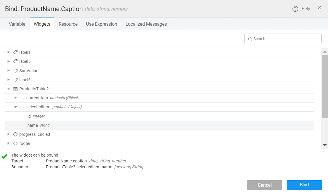 ServiceSalesByProduct, configure the Data to bind withproductId. - Go to the widgets tab, select