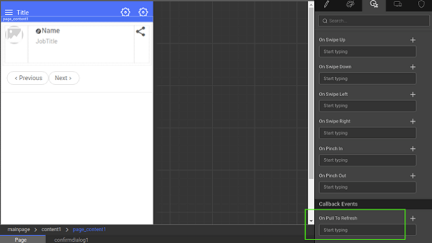 1. Set an action to the Pull to Refresh event. For example, open a dialog as shown below.
