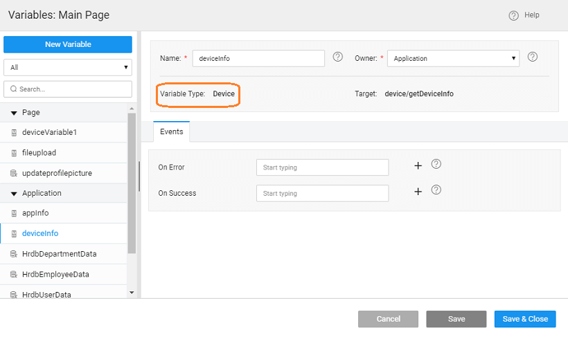 Device Variables can be created to access various Device Features. For example, contacts, geolocation, and more.