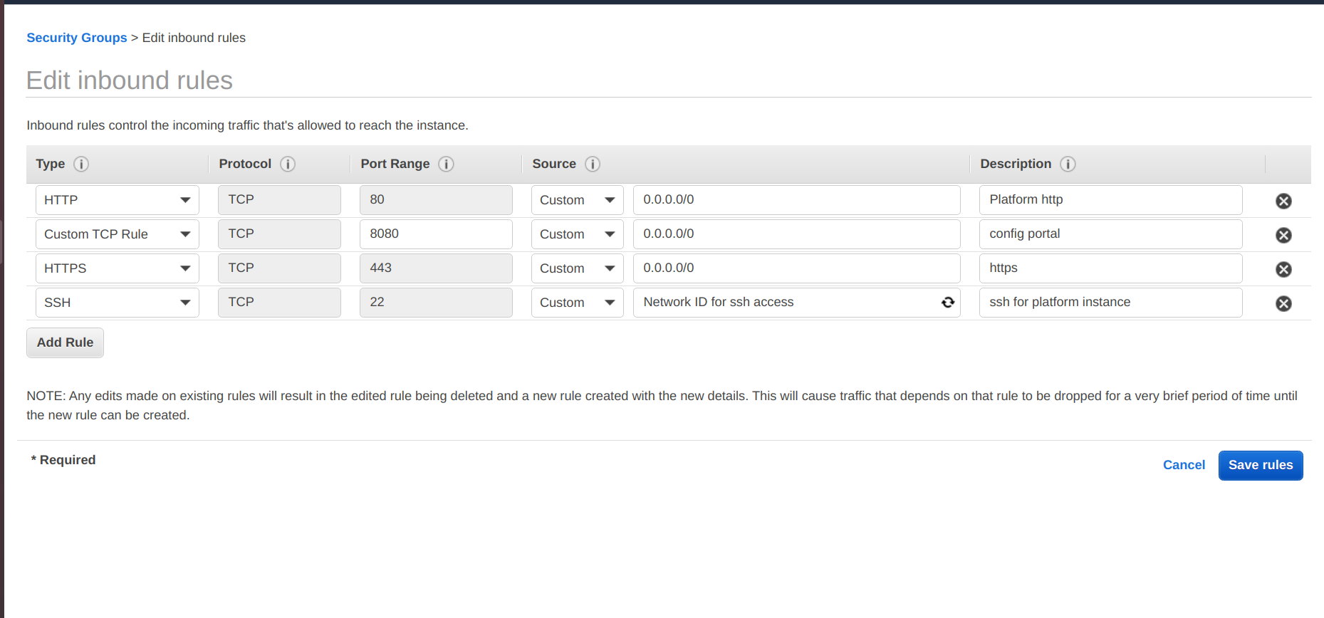 • Select inbound rules and edit rules to access from the Platform Instance. At the source field, provide WME-SG-Platform-Internal security group ID.
