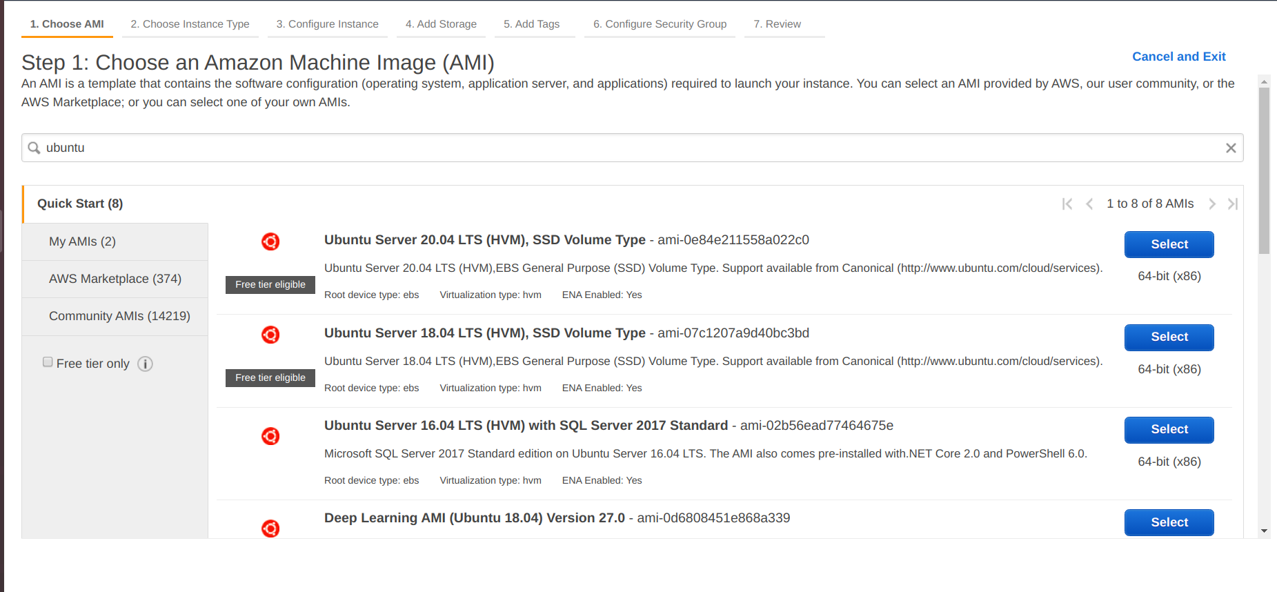 • Choose Launch Instance, choose an ubuntu 16.04 Amazon Machine Image (AMI), or if you have any ubuntu 20.04 AMI, select it.